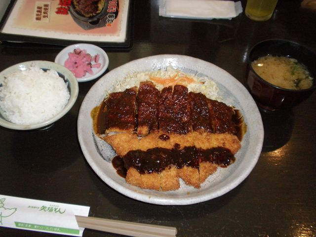 お昼も大分過ぎてしまったので、事前に決めておいた「わらじとんかつ」を注文。今回は味噌ソースととんかつソースが半分づつかかったものを注文。