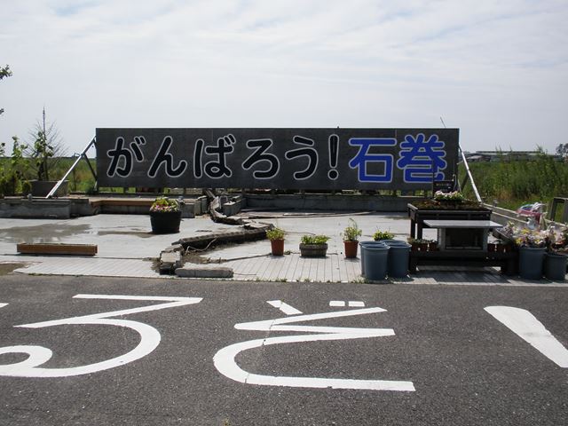 さて、いきなり自然の猛威に洗礼を受けショックを受けつつ、次のポイントへ目指します。次は「がんばろう石巻」と掲げられた看板のある石巻市街地付近へ。最近はナビに慣れてしまった為か、年のせいか(笑)道をよく間違えます。予定より1時間近く遅れ、「がんばろう石巻」の看板に到着したのは午前11時。ちょっと急ぎ足で見て回ります。