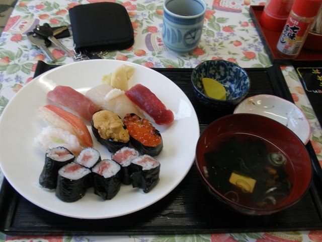 ここでようやくお昼です。すっかり1時を過ぎて暑いのとのどが渇いたのでヘロヘロです。で、早速「伝八寿司」さんへ入り、上寿司を注文。壁に貼ってある色紙を眺めてしばし待ちます。いろんな人の色紙がありましたが、自分には誰がどれだかわかりませんでした 汗(きっと有名人もあったと思います)