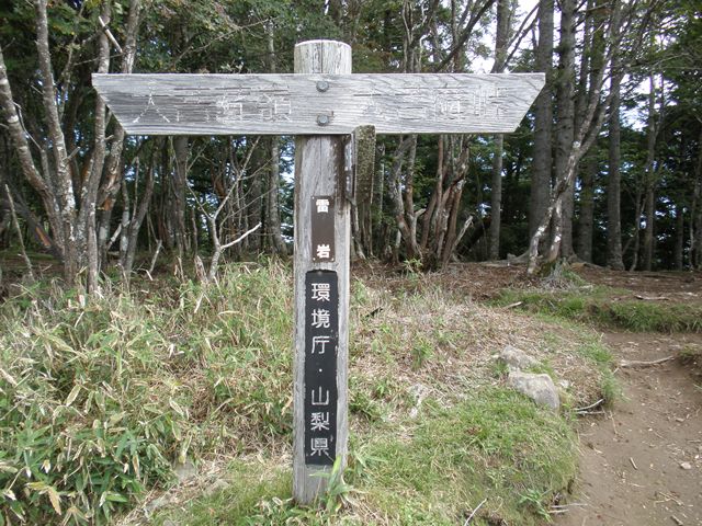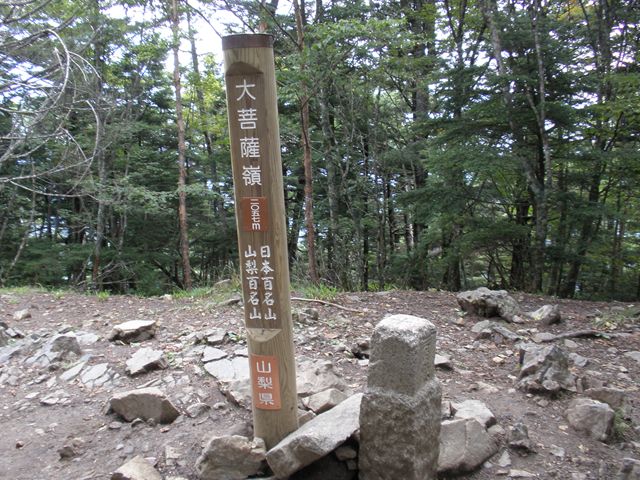 眺望の良い尾根道から林の中を歩き始めること約5分、ついに大菩薩嶺登頂成功!確かに山頂ではあるけれど、まわりは木に囲まれて眺望は全くなし。写真だけ撮ってそそくさと引き返します 笑