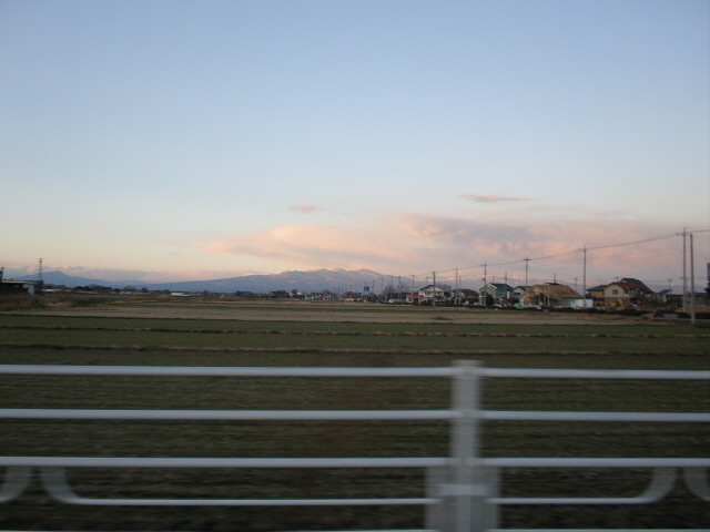 だんだん日が落ち始め、帰りの車窓から冠雪した山々を眺めます。