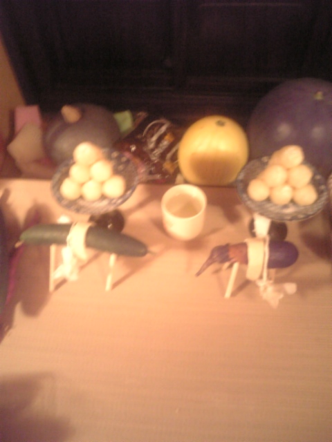 実家は農家なのでダンゴやキュウリとナスで作った牛馬なども添えます。