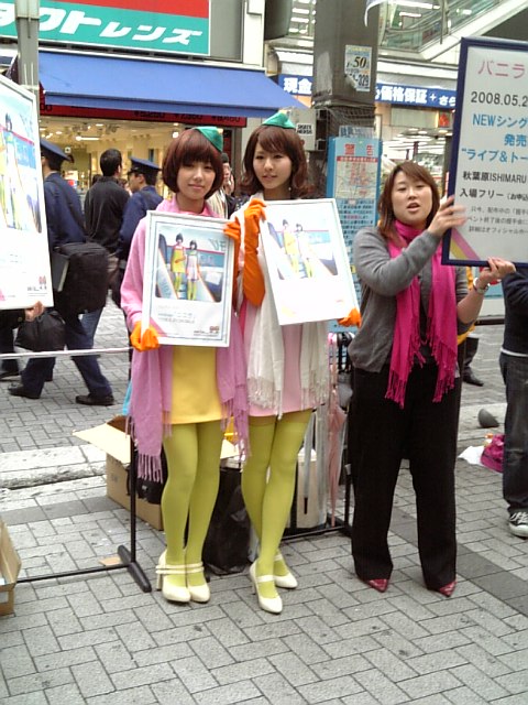 まずは秋葉原で下車して無線のQSLカードをゲット。QSLカードってのはいつ何時に貴局(一応アマチュア無線局なので)と交信しました、と証明する為のカードです。最近はアキバに来ても無線関係のお店が少なくなって流行りは「カード」と「萌え」ですね。オタクが市民権を得てから秋葉原も大きく変わりました。帰りにこんな人達がいたのでとりあえず写メしときました。