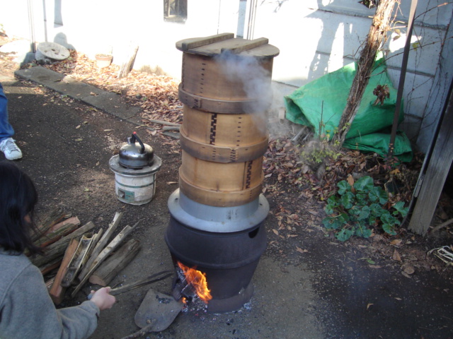 もち米の洗いは昨日ばあちゃんがやっておいてくれたので炊き出しから!