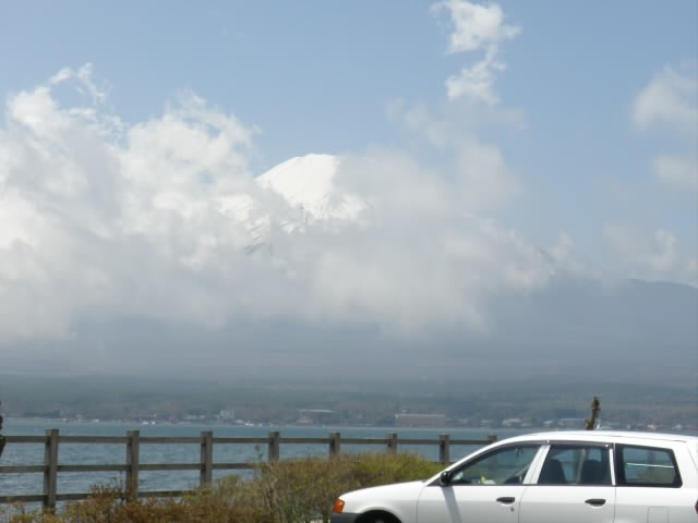 道志を抜け山中湖が開けると富士山! ・・・今回も雲でイマイチ、残念!
