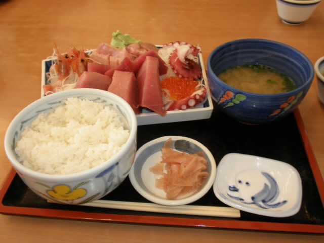 待つこと30分、ようやく席に着き、出てきたのがコレ! 比較するものがないのが残念ですが、マグロのブツ切りは一切れで普通の1人前くらいあります。そのほか、イクラ・エビ・イカ・タコ・・・なんでもアリ!